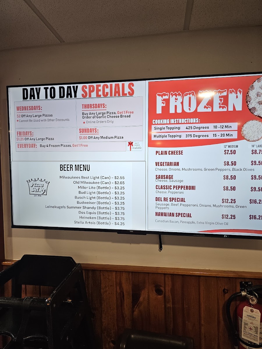 Large veggie pie loaded with fresh mushrooms, onions, green peppers, green olives, and black olives. A veggie lover's dream on a perfectly baked crust!