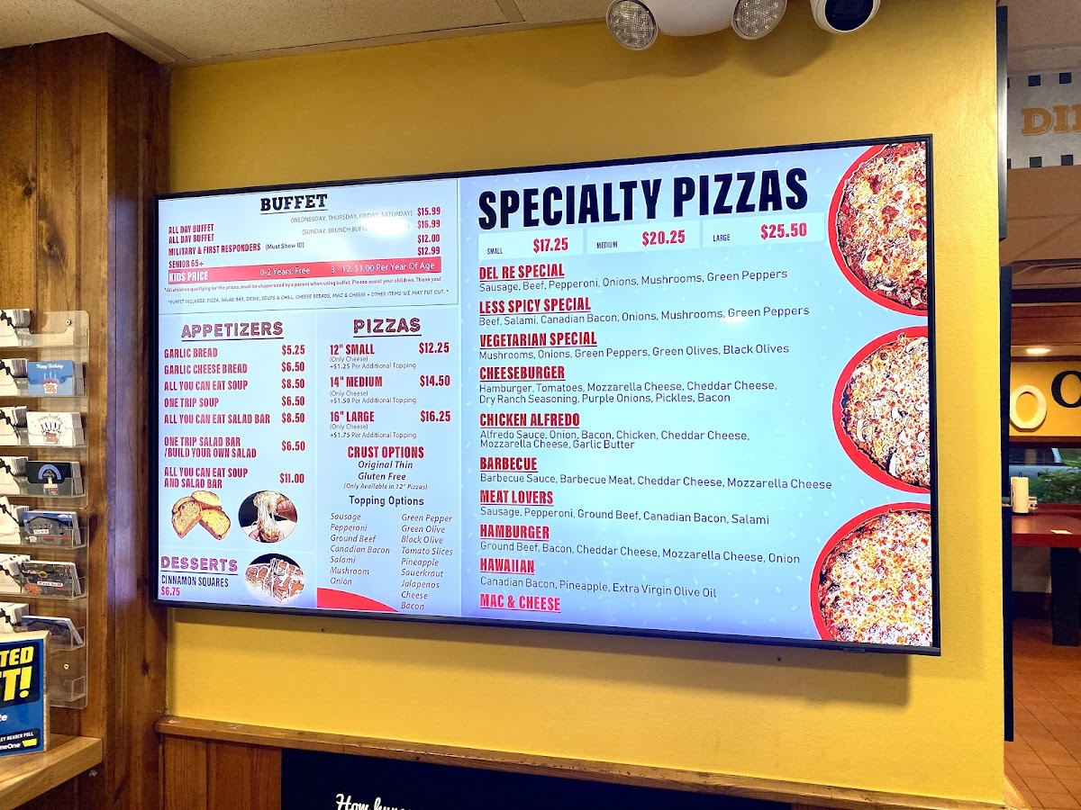 Large pie topped with juicy hamburger, fresh tomatoes, mozzarella, cheddar cheese, dry ranch seasoning, purple onions, pickles, and crispy bacon. A burger-inspired pizza packed with flavor!